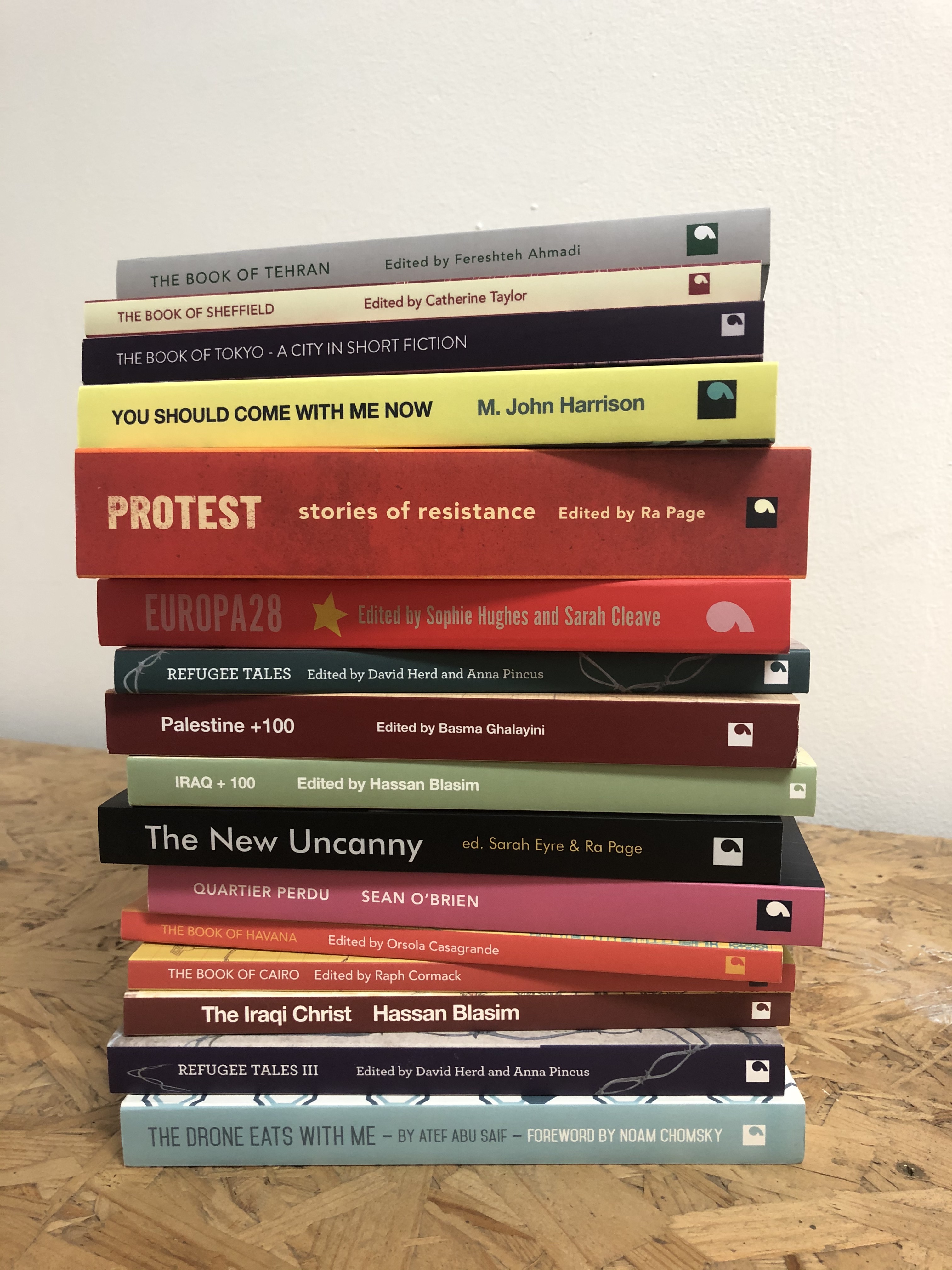 If you don’t know of Comma Press, allow me to introduce us: we’re an independent, not-for-profit publisher based in Manchester, England, and we specialise in short stories and fiction in translation. Our aim is to publish new, exciting and often marginalised voices from around the world. We publish interdisciplinary collaborations between authors and translators, historians, scientists and activists, which include anthologies covering over 2000 years of British protest as well as the first anthologies of science-fiction from the Middle East. We have an Arabic imprint, which features collections by award-winning authors such as Hassan Blasim and Nayrouz Qarmout. We have a popular and recognisable ‘Reading the City’ series, a British horror series, and we publish the BBC National Short Story Award shortlist anthology annually.