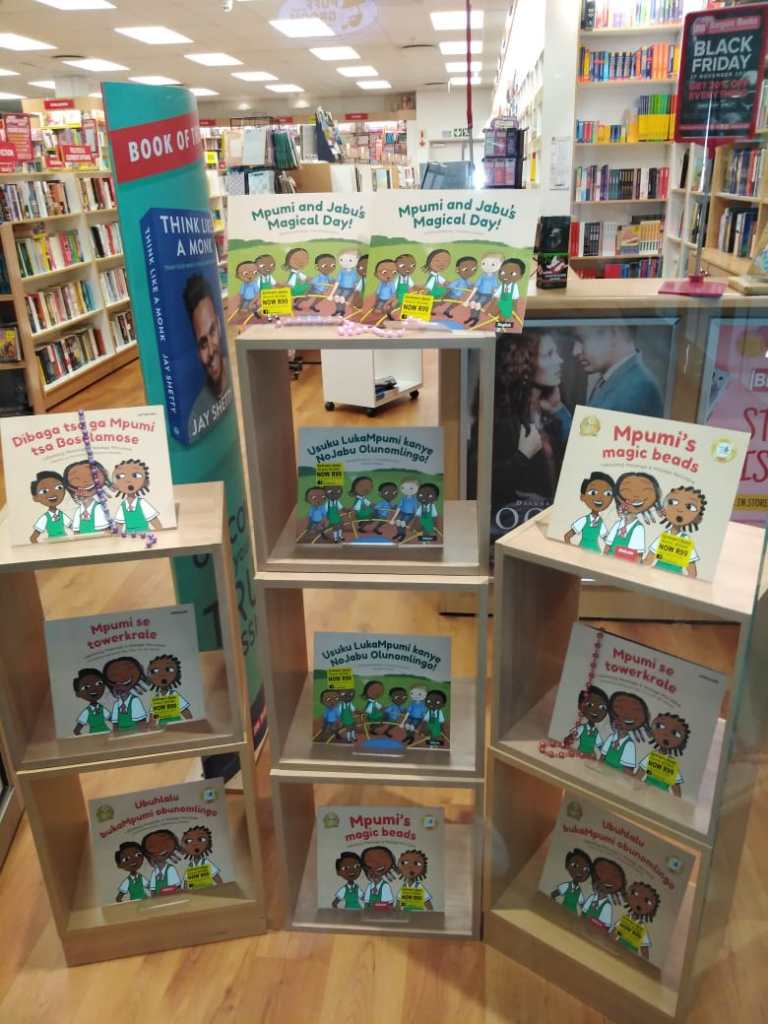 Mpumi’s Magic Beads and Mpumi and Jabu’s Magical Day on display at Bargain Books, Cradlestone Mall, Johannesburg