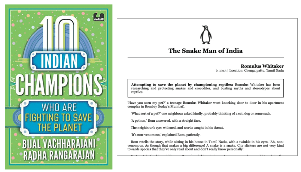 - Vaccharajani, Bijal and Rangarajan, Radha. (2020) 10 Indian Champions Who Are Fighting to Save the Planet / INDIA / Non-Fiction / Published by Duckbill Books