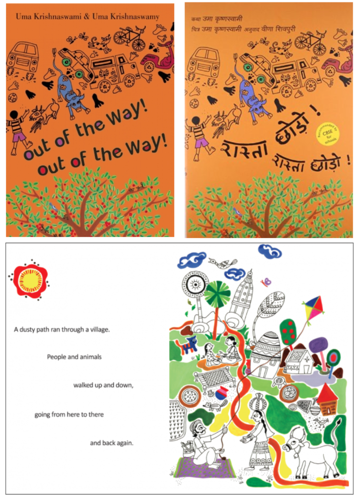 Simply told and beautifully illustrated, this picture book follows the rescue, growth and impact of a tree growing in the middle of a road in India. A sapling is rescued by a small boy in a village in India. As he cares for the tree and it starts to grow, he is constantly told, “Out of the way!” as the busy villagers hustle around him. The dirt road is paved. The village becomes a town, and then a city with cars, buses and trucks constantly swerving to miss it, but the tree remains, offering shade, comfort and a home to a range of people, animals and birds – even in the middle of the city.