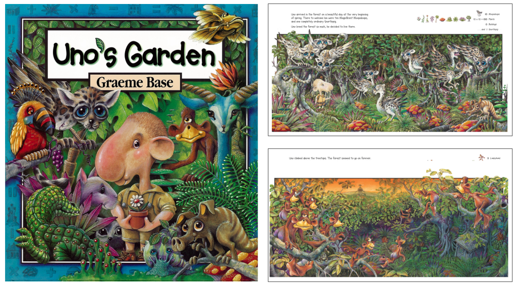 Uno’s garden follows the changes wrought by the arrival of men into a previously untouched forest populated by fantastical and magnificent creatures, and one completely ordinary snortlepig. As Uno build’s his home and more people arrive, as the small town becomes a village, then a city, then a megacity the animals begin to disappear until finally the last snortlepig is no more. Then… the people abandon their cheerless, overcrowded and dirty city, leaving Uno to rescue the last remaining tree. Uno and his family then begin the long and arduous job of re-establishing the forest and luring back the animals that had gone. The math shown in the book, further highlights the ease of destruction, and the hard labor and time needed to undo the damage.