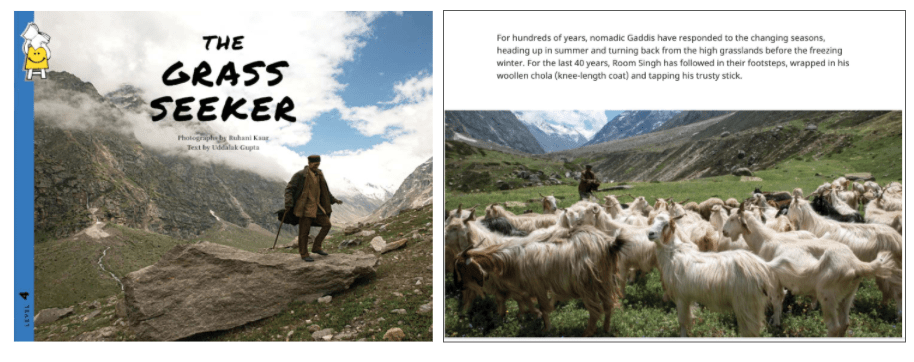 The Grass Seeker by Uddalak Gupta, photographs by Ruhani Kaur (2020) / India /  Read free on Storyweaver / Available in English, Hindi, Kannada, Marathi, and Telegu