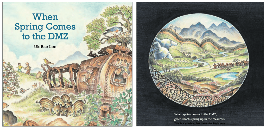 In this picture book, the reader follows a grandfather as he travels to the South Korean fence at the DMZ to gaze at his former home in North Korea. In soft illustrations, it shows the stark contrast between the natural beauty of the thriving nature of the DMZ with the harsh realities of the soldiers, razor wire and detritus of war.