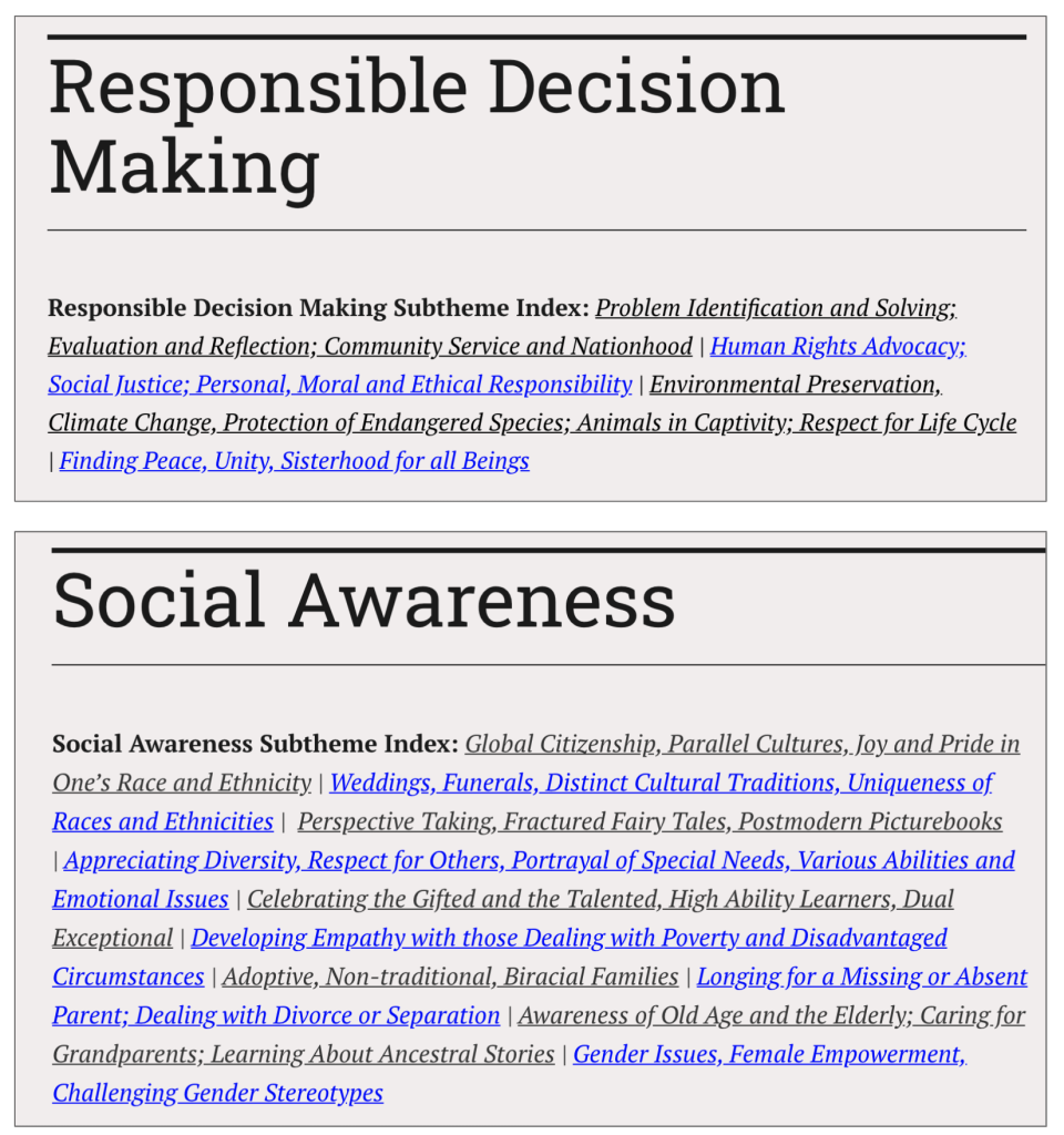 Myra was here in Singapore at the National Institute for Education for years, but now works at the United Arab Emirates University. And the beauty of her work is the identification of picture books that address so many subcategories (read: tags and subject headings) — which all librarians need to consider as access points for resources.