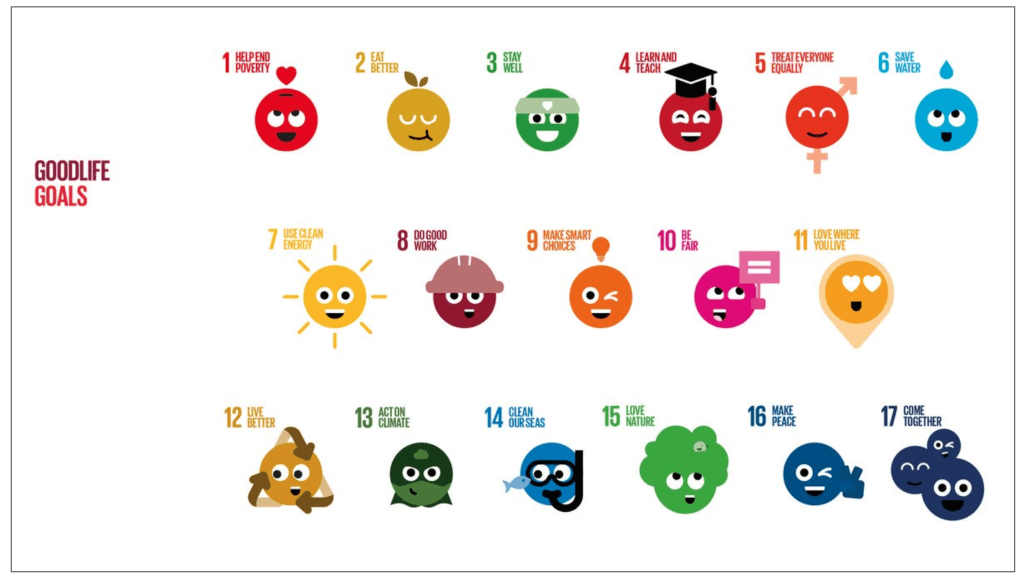 The Good Life Goals have been shaped through a multi-stakeholder collaboration between Futerra, the 10 YFP Sustainable Lifestyles and Education program, co-led by the governments of Sweden and Japan represented by the Stockholm Environment Institute (SEI) and the Institute for Global Environmental Strategies (IGES), as well as UN Environment, UNESCO and WBCSD (the World Business Council for Sustainable Development).