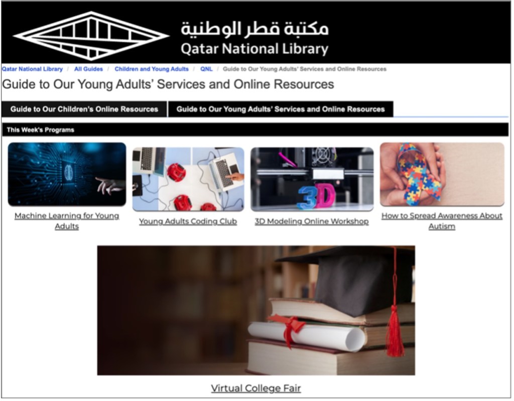 Since the outbreak of COVID-19 in March 2020 that led to some closure of public establishments in Qatar including the Library, the Young Adults’ Library has organized more than 100 online programs covering topics such as information literacy, authors’ visits, public speaking, technology, sciences, college fairs, cultural events and other relevant topics for young adult development. Through the Library’s website, young adults can participate in a variety of online events. They are also encouraged to provide feedback at the end of each session in order to improve future Library events and help designing Library programs.