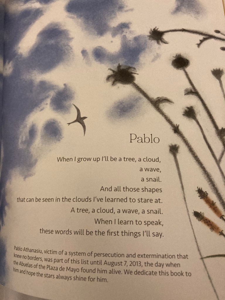 Las Abuelas de la Plaza de Mayo found one of the children, Pablo alive in recent years and this book is dedicated to Pablo, see the poem in the image above.