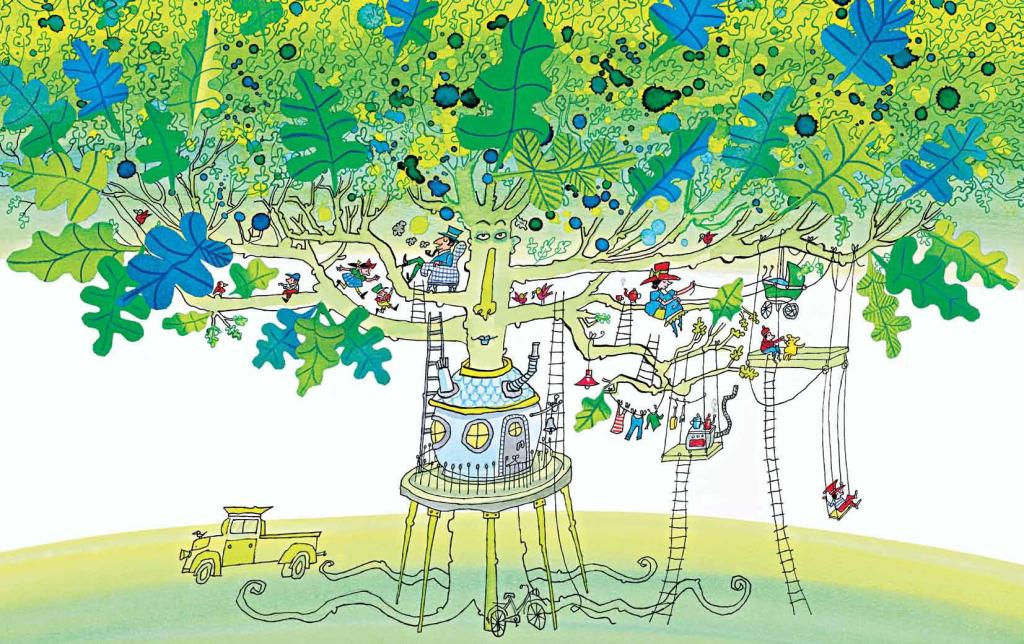 I certainly have spent some wonderful moments with Aunt Sue and Uncle Steve’s treehouse, branches where children chase each other, platforms and ladders lead to laundry, Uncle Steve in an armchair, a hanging baby buggy: “They sleep up there and eat up there / It’s very cosy, in the air”: