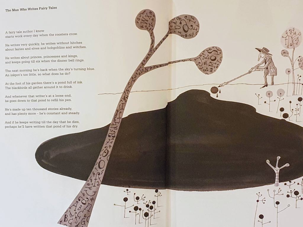 The Man Who Writes Fairy Tales has run out of ink. Luckily for him, there is a pond full of the rich black stuff at the foot of his garden where he can go to fill up his pen whenever inspiration strikes: “He’s made up ten thousand stories already / and has plenty more — he’s constant and steady. / And if he keep writing till the day that he dies, / perhaps he’ll have written that pond of his dry:”