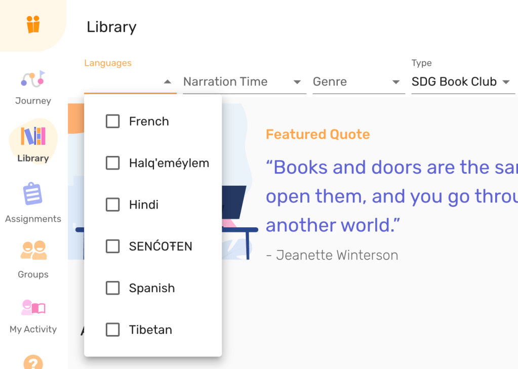 You can also filter on languages, including two First Nation languages. Helena, the Educational Success Lead at Simbi, says that they are continually adding new languages and books to the platform.