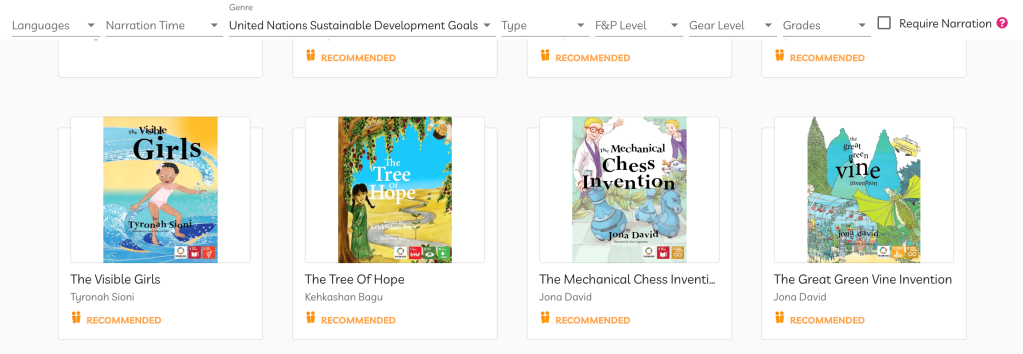 You can also sub-select on other aspects, e.g., Narration time, F&P (Fountas & Pinnell reading level), Gear Level (Emergent / Beginning / Developing / Proficient), Grades (Early Emergent Reader – Grade 12), and Type (e.g., books good for teaching particular literacy skills).