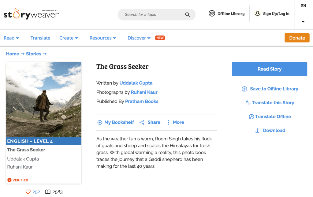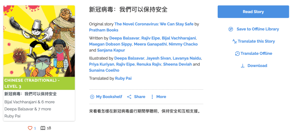 Languages range from French and Indonesian to Russian and Tamil, from Assamese and Chhattisharhi to Kora and Santali. Don’t forget others like Hindi, Italian, Korean, Odia, and Saurashtra too. Pratham Books works to verify as many of the translations as it can, although this does take time, especially as a small nonprofit team. Books with verified translations are marked as such and there are more verified than unverified translations on the platform.