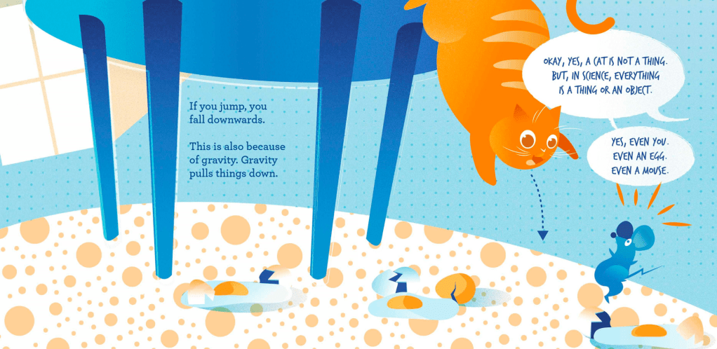 Dominantly rendered in tones of blue, green, cyan, and purple respectively, the books walk a child through the science behind the phenomena mentioned above. Scientific terms are printed in bold to gently set them apart from the rest of the text. Each spread also contains the narrator’s clever, snappy conversation with her cat, Smartypants (depicted in a lush orange), which is related to the facts discussed.