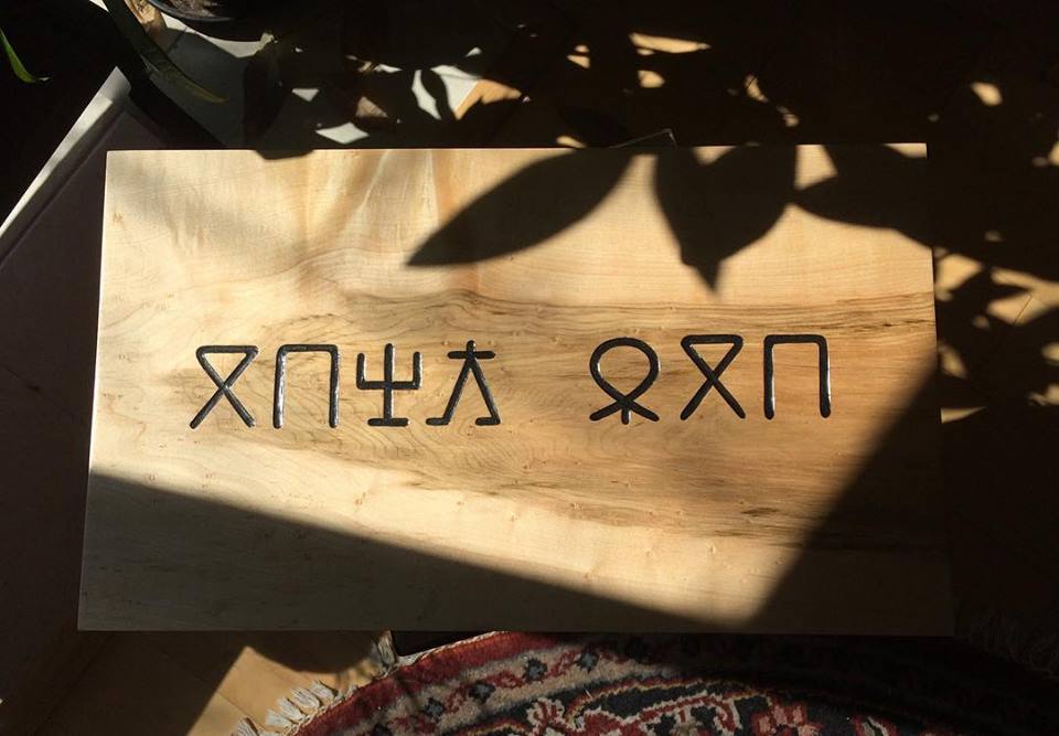 “Save our language” in the Zaghawa language and the Beria script, in which each letter resembles a camel branding symbol. Carved by the author.