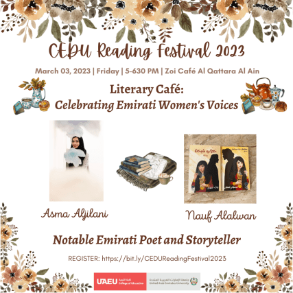 During the College of Education’s month-long Reading Festival (see here), I had the opportunity to listen to Nauf Alwan talk about her experience writing this book in our Literary Cafe Session, along with another Emirati female author, Asma Aljilani.