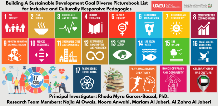 There are 17 official United Nations SDGs, but we took the liberty of adding three more categories, after reading quite a number of diverse picture book titles which we feel do not easily fit into any of the 17 SDGs. These are (1) play, imagination, and creativity, (2) bonds of family and community, and (3) celebration of UAE culture. What inspired this research is the naming of 2023 as the year of sustainability in the United Arab Emirates (UAE).