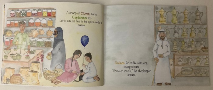 This picturebook represents some of the core values in Emirati extended families by showcasing the grandmother taking her grandchildren to the traditional market “The Souq”. It also showcased the incredibly diverse international scene of the UAE, consisting of traders who are selling goods from Oman, Levant region, Iran, Turkey, India, Pakistan, along with Emirati sellers with their local food and products. In addition, the phrases rhyme in every page, and a comprehensive Glossary of Arabic words can be found in the last page.