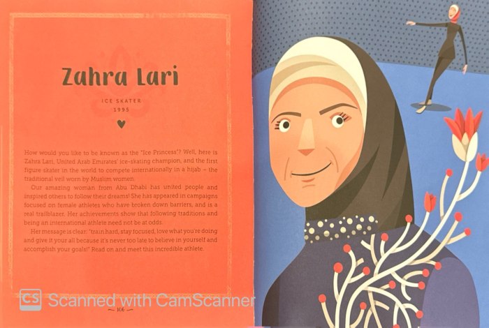 I read about Zahra Lari from the United Arab Emirates, and I instantly got inspired by her life story. From when she was little, she knew she wanted to compete in ice skating, and she started practicing to become a professional skater. I liked her quote: