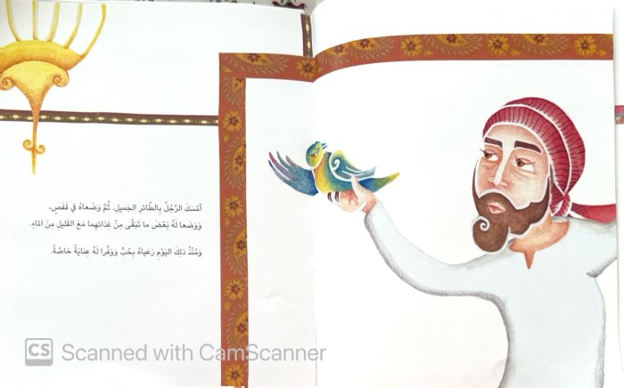 I think this book teaches us the importance of being honest, and smart ways to solve problems. My favorite part of the story is how the man got his bird back. I liked the smart way the Sheikh solved the problem. My favorite illustration was when the man caught the colorful bird. I also noticed that there were many frames throughout the book that showed textures of Emirati design and art.