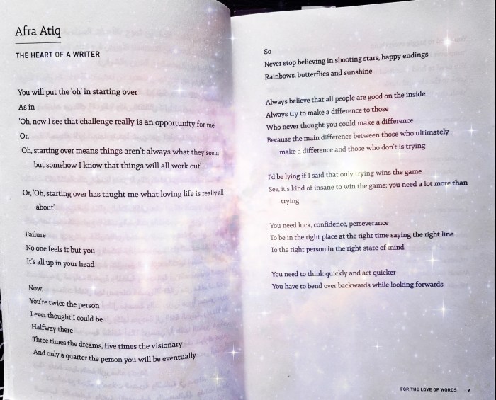 Our featured poet for this post, however, is UAE’s esteemed contemporary Emirati poet who writes some of her poetry in English, Dr. Afra Atiq, who celebrates what it is to be a writer in love with words. I am hoping that the Poetry Friday community would find beauty in Dr. Afra’s exploration on the heart of a writer. I took photos of the pages from the book and edited using an app. Enjoy!