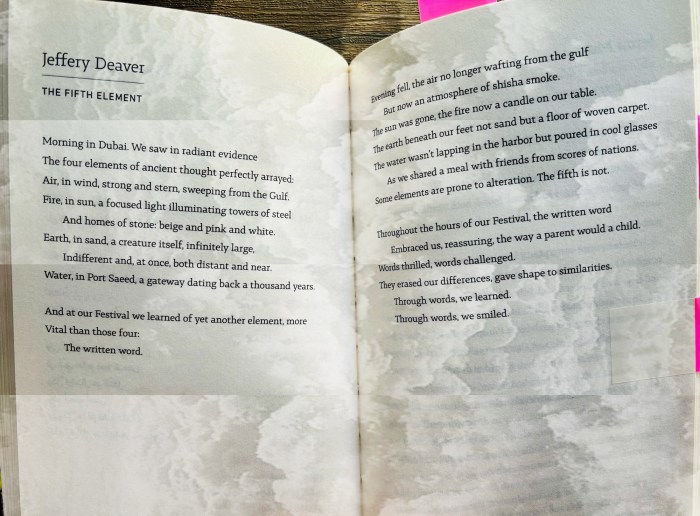 I especially appreciated how some of the international authors used their contributions to this anthology to share in verse what attending the festival means to them. See for example this ode to the Emirates Literature Festival written by Jeffery Deaver, bestselling author of the Lincoln Rhyme series (I took a photo of the page from the book and edited using an app – similar to some of the other pages you will find below):