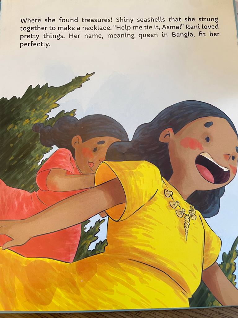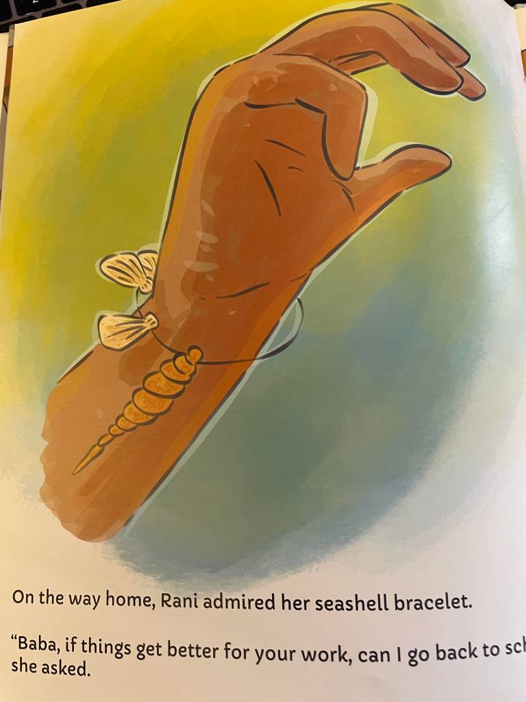Taking place in Cox’s Bazar, Bangladesh near a Rohingya camp, Rani enjoys being by the sea and collecting shells. In fact she makes herself a very pretty seashell necklace.