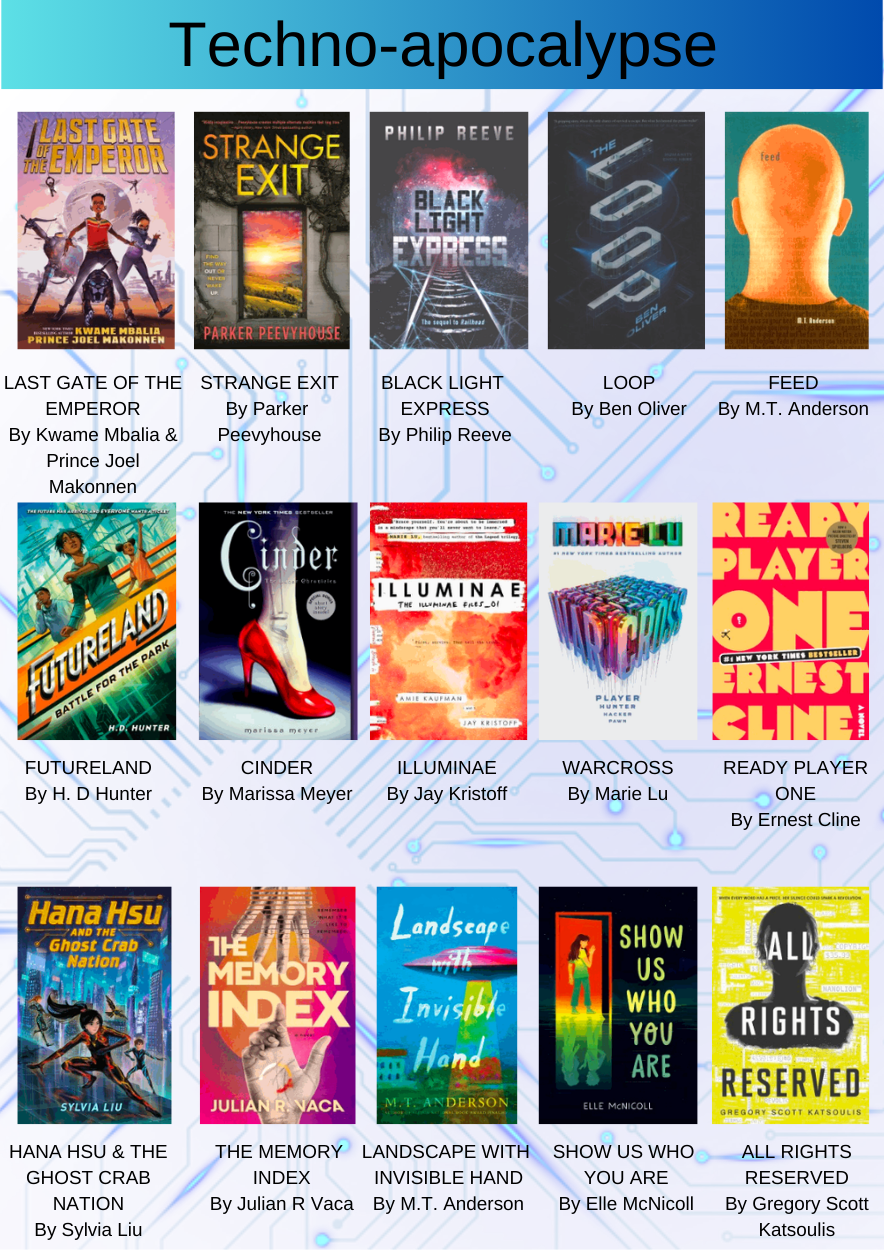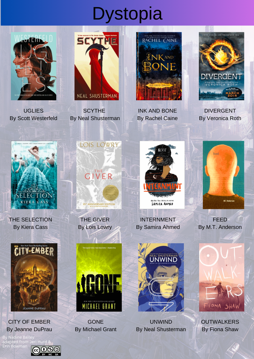 Our Grade 7 students do a dystopian unit in their English Language Arts (ELA) class, and I came across this nifty categorisation in a poster by Jeri Hurd (sans the sub-pages / images). Since I find our students are increasingly stimulated by imagery, rather than just text, I adapted the poster to include 7 sub-posters combining the books in our collection to the suggestions.