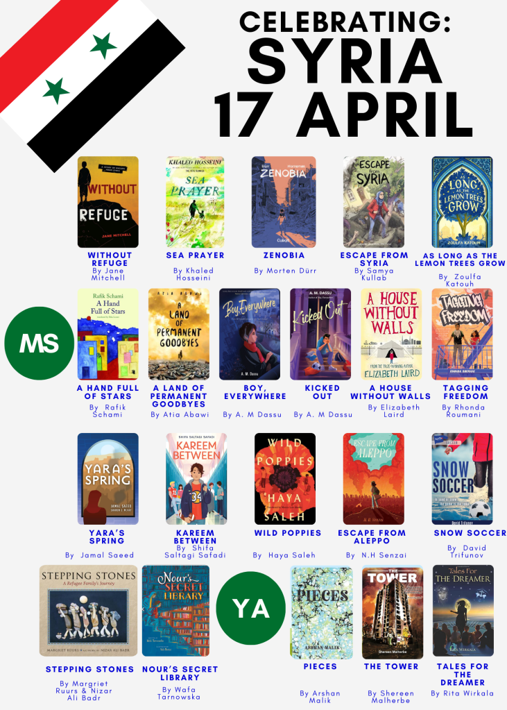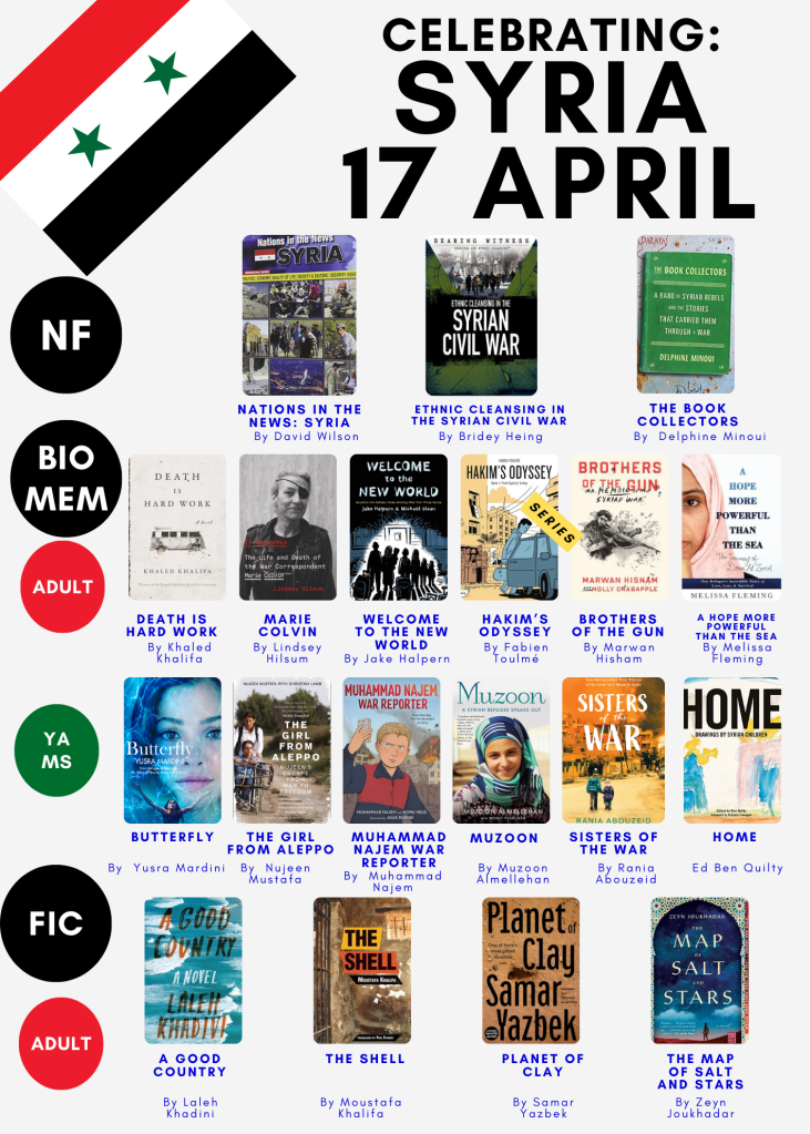 Isn’t it great to finally have a bit of good news? Today’s two posters have books, nonfiction, memoir, biography and fiction for all ages – adult, YA, Middle Grade and picture books about Syria. Usually I wait until the month of the national day to put together a country poster, but today I squeezed in some time for our books on Syria as I think it is important to dwell on the journey the country has been through since 2011. Our G8 students read Atia Abawi’s “A Land of Permanent Goodbyes“