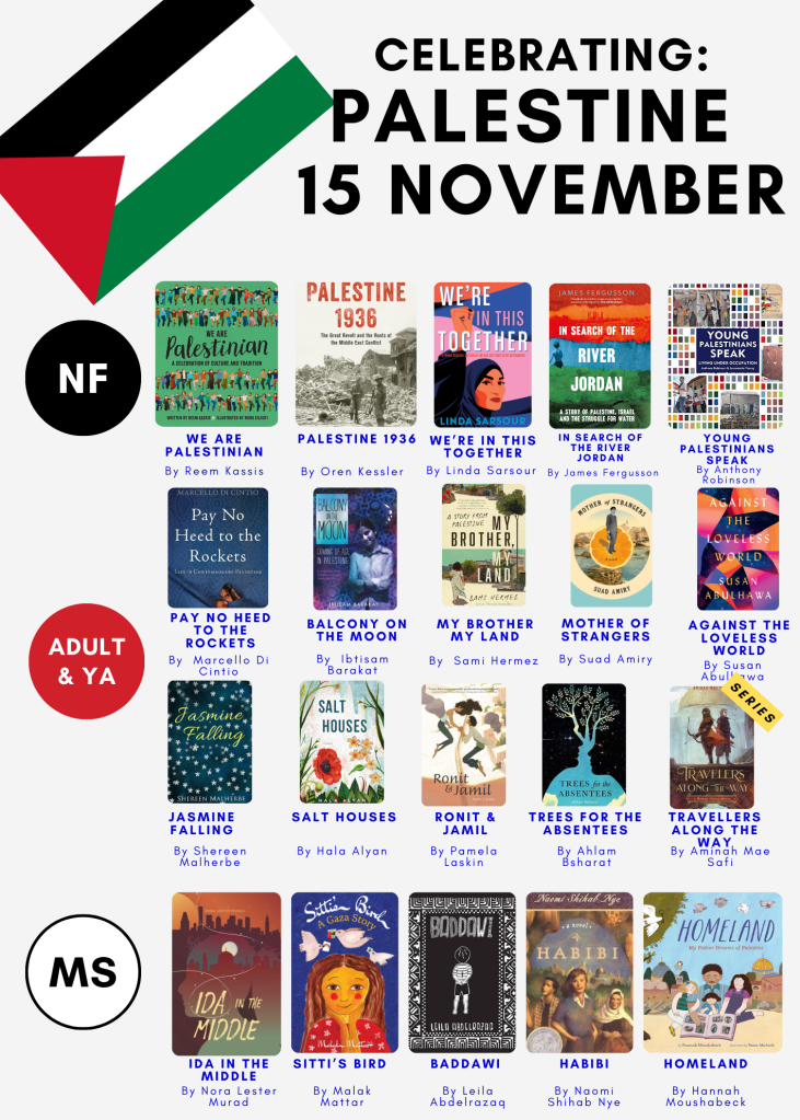 For Palestine – “We are Palestinian by Reem Kassis and illustrated by Noha Eilouti“. It is almost unimaginable that such a beautiful celebration of culture and tradition can come out of a country so devastated. It is also a book that provides such incredible solace to our students from Palestine as it is life and culture affirming. Illustrated nonfiction picture books are not often amongst my top-circulating items, however this book is. It is beloved not only by students from Palestine but also those who want to know more about the peoples of Palestine. And in fact just last week one of our social studies teachers looking for inspiration for his “colonies and colonization” unit picked it up to use as a template for students to use when interviewing their relatives about the places they come from.