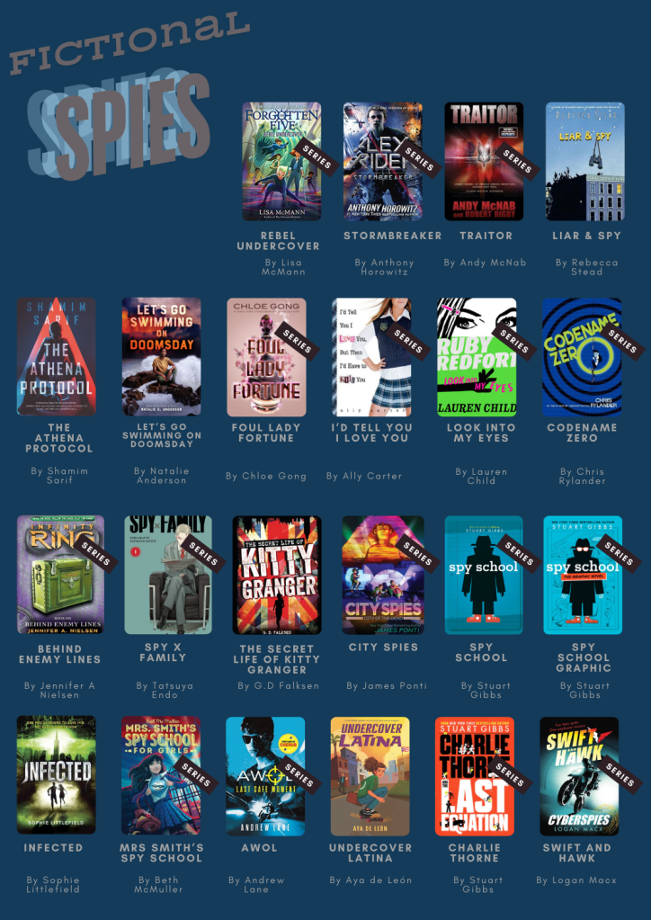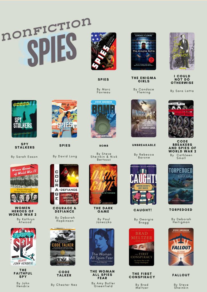 Anyway, making these blogs motivated me to put a trio of posters together on nonfiction, historical fiction and fictional spies. The great thing about fictional spy stories is that almost all of them come in super long series, so once a student is hooked on the first in the series you can keep them going for quite a while.