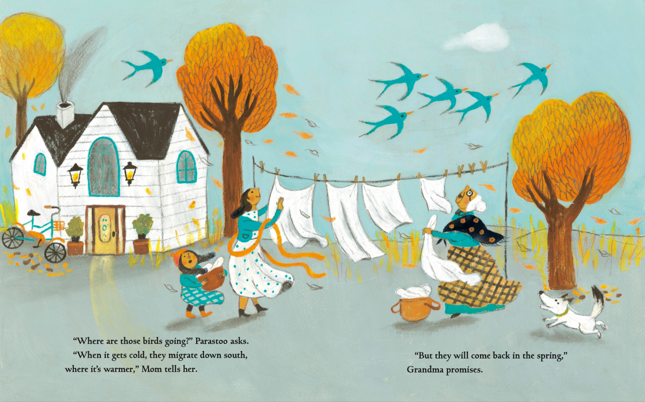 Following Parastoo*, a little Iranian girl, as she observes migrating swallows and anticipates her mother’s return in spring, the story illustrates how seasons affect life and emotions. Set against an Iranian cultural backdrop, it highlights intergenerational wisdom and the emotional resilience tied to natural changes. Kheiriyeh’s vibrant illustrations bring the seasons to life, engaging young readers and inspiring inquiry into nature’s rhythms and human connections.