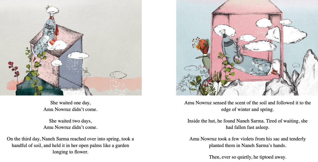 Amu Nowruz and His Violets is one of my favorite in this post because of its vibrant illustration and beautiful story. Rooted in Persian folklore and through its exploration of seasonal transitions, cultural traditions, and nature’s interconnectedness, the story illustrates the shift from winter to spring with Naneh Sarma (Mother Frost) and Amu Nowruz (Uncle New Year), symbolizing renewal and growth. It celebrates the Persian New Year, promoting global cultural understanding while emphasizing the relationship between seasons and nature’s cycles. Nooshin Safakhoo’s lively illustrations further engage readers, making abstract concepts tangible and inspiring inquiry into seasonal changes and cultural rituals.