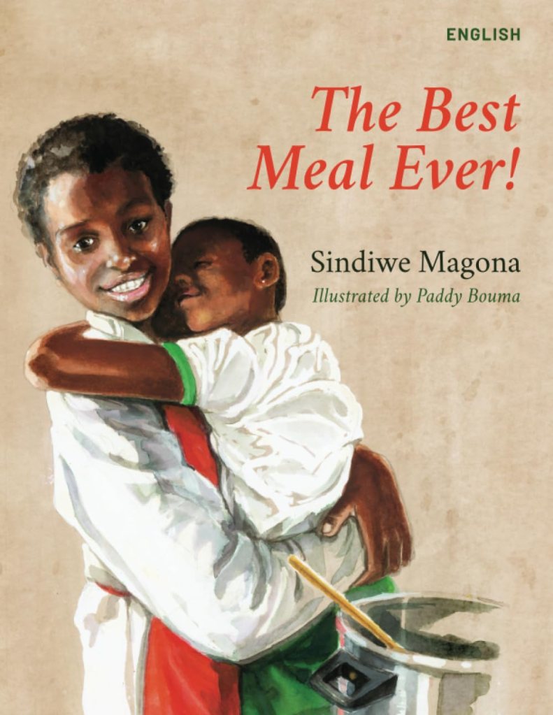 Most beloved is The best meal ever! by Sindiwe Magona, beautifully illustrated by Paddy Bouma. It tells the story of a brave big sister who quietly bears the weight of the fact the cupboard is bare as a bone, and she has hungry little siblings to feed. She boils water on the stove and weaves a story of hope about what she will cook, until they all fall asleep. In the morning ,they wake to the wonderful redemption of actual food.