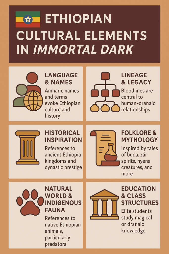 Young Adult fiction does not really exist in Amharic or other Ethiopian languages, and the paranormal genre worldwide has only recently begun to include Black main characters and stories based on African mythologies, notably Tomi Adeyemi’s Children of Blood and Bone series and the worldwide success of the Black Panther films: “Generally speaking, high and paranormal fantasy are canonically white worlds” (Source).