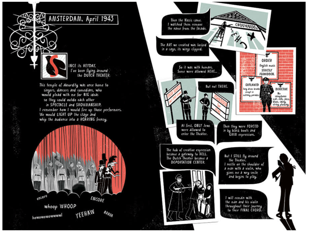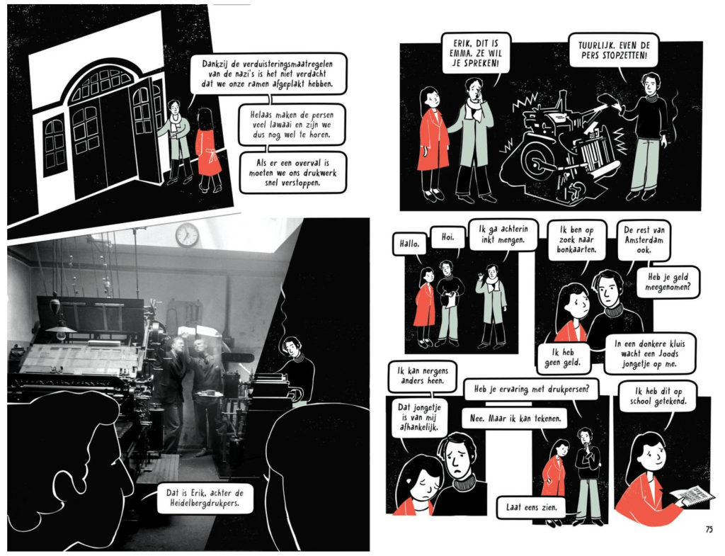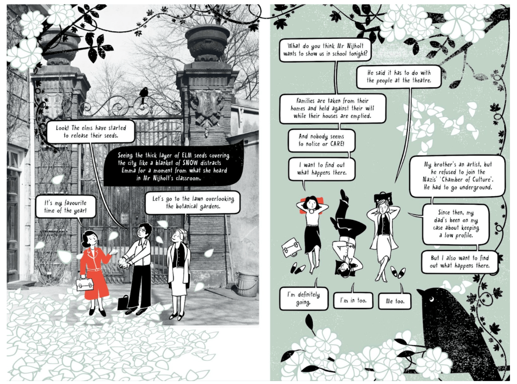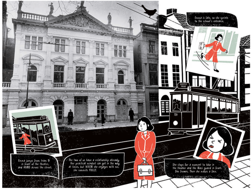 Van Lieshout uses archival research to integrate period photos into her text, creating collages that seamlessly interject historical accuracy and the unique geography of Amsterdam within her striking graphic panels. Through this interplay of physical media and graphic novel conventions, she explores themes of creating art as resistance and acts of moral courage, harnessing the power of memory and intergenerational trauma, and capturing the importance of critical thinking in the face of propaganda. These themes work together to create a graphic novel that is not just a historical account, but a contemporary reflection on art, activism, and remembrance.