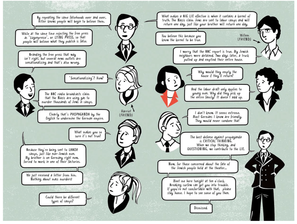 That early exchange in the classroom, was that moment meant to serve as a kind of framing device for the themes of propaganda, resistance, and the larger role of art through printing, forgeries, and even Street Art? Am I reading that right?