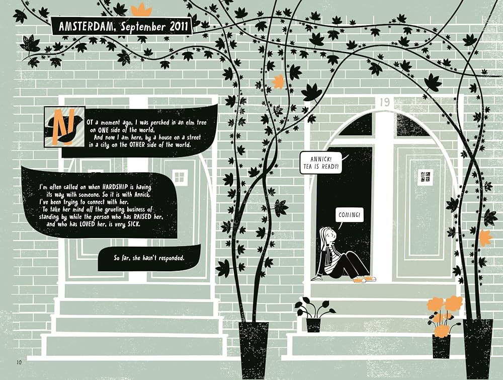 What binds these stories together is the haunting, omniscient song of an Amsterdam blackbird, a symbolic narrator perched among the city’s elm blossoms, who sees across generations and time. The blackbird’s observations and interventions are represented by black silhouettes, white text, and dynamic, black-winged thought balloons flying in and out of panels.