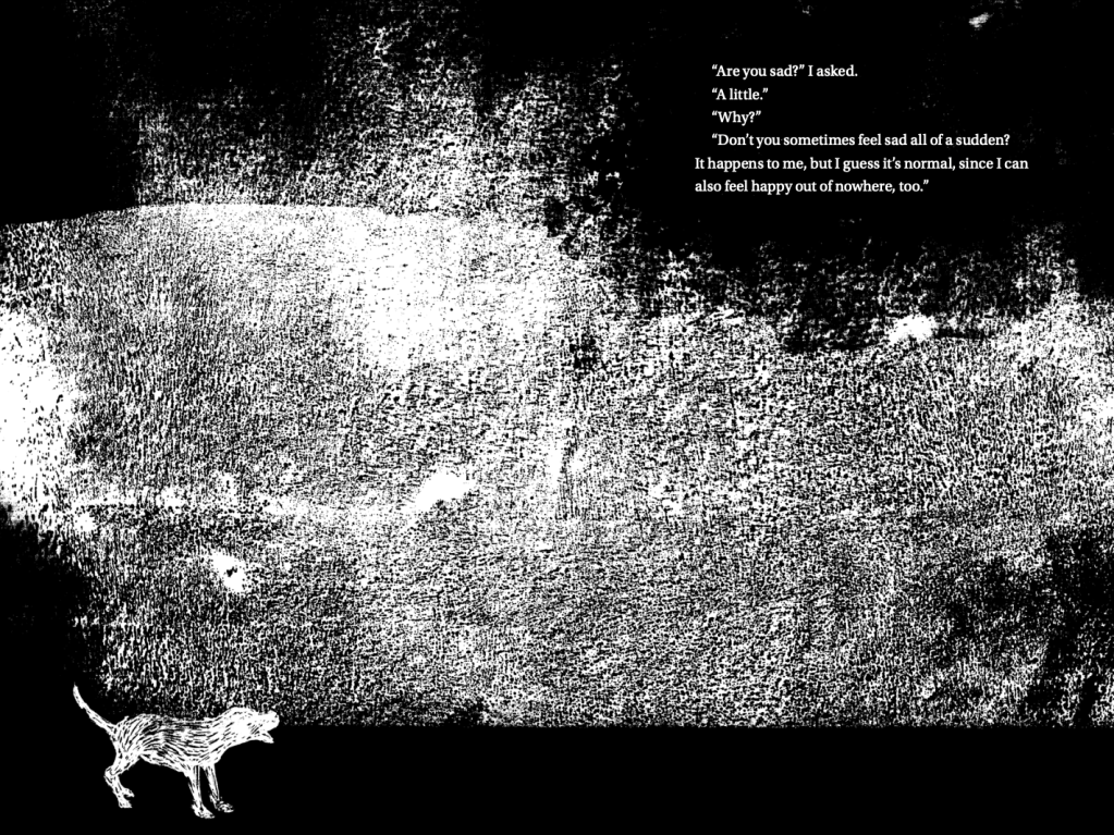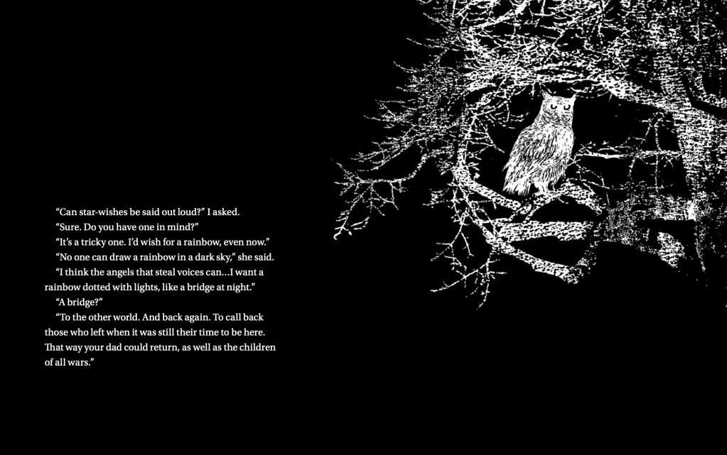 That’s why I was thrilled to discover Our Beautiful Darkness (Uma escuridão bonita) by Ondjaki, illustrated by António Jorge Gonçalves, translated by Lyn Miller-Lachmann, and published by Unruly/Enchanted Lion, among the submissions for the 2025 GLLI Translated YA Book Prize. It did not give me the keen insight into my young patrons’ pasts I’d hoped for, but it did give me an incredibly immersive experience. The titular darkness is caused by a power outage, which creates a singular, protective space for two young people to reveal themselves to each other. It’s a rich and sensory text: “In this darkness of sweet melody or warm silence, between the buzz of mosquitoes and the whiff of a match lighting the first candle inside my house, I found the courage to speak,” says the unnamed narrator. Later: “I passed my tongue slowly over my lips. They told me they felt lonely”; and later still: “Here outside in our shared darkness, between the hum of a cricket and the buzz of a firefly, she found the courage to speak.” The intensity of these two teens’ attraction to each other is palpable. Gonçalves’s white-on-black illustrations offer up glimpses of the characters, amplifying the intimacy of their experience within the enveloping darkness.