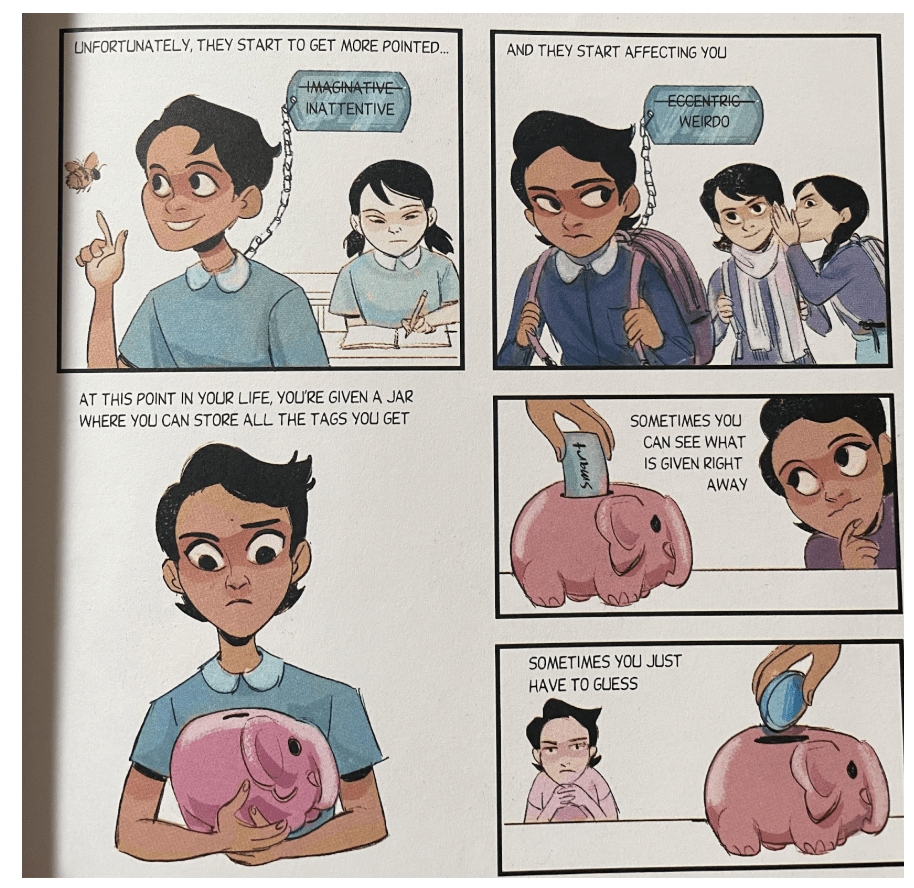 The first story, “Nametag” by Adhora Pototry, opens the anthology with a powerful exploration of identity and the labels we carry—from birth through every stage in between. Her illustrations complement the narrative seamlessly, with each panel capturing the character’s joy and frustration with the names she’s given. Some labels are arbitrary and fleeting, while others linger and define. The character collects these names in a piggy bank, observing how many are negative and how few are positive. Pototry also highlights how a single word can shift the perception of a person—for example, being called “inattentive” instead of “imaginative.” This coming-of-age story resonates deeply, reminding us how we are shaped by the names others give us, and how we continuously negotiate our own sense of identity throughout life.