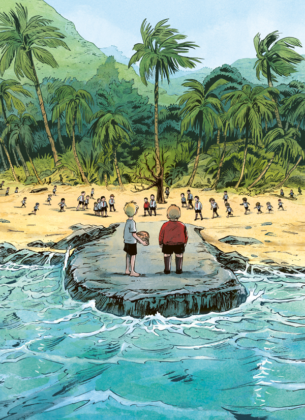 De Jongh started out trying to write the adaptation herself. However, believing that her level of English was not going to work for a Nobel Prize for Literature winner’s book, de Jongh made the choice to use Golding’s original text. And despite being “fully aware that these may sound old-fashioned at times” it worked brilliantly: “It gave the graphic novel something timeless, which I liked. It wouldn’t have worked to let the kids talk more modern, more hip” (Tayce).