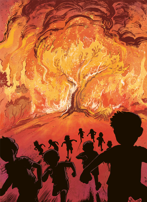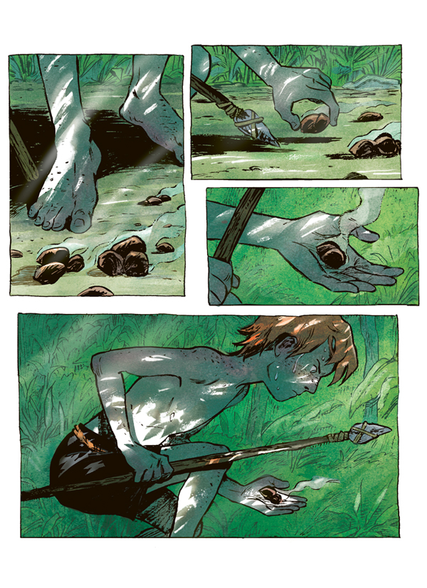 De Jongh collaborated closely with Golding’s family on the color palette of the novel, deciding to use bright, sunny colors in the beginning of the book and then, as the reader goes deeper into the story and the atmosphere changes, using colors that darken into grayer hues: “They [Golding’s family] said their father was trying to start off on a very bright island with lots of hope and fun and games and then slowly it would decay into darkness, so that’s one of the things I changed and I was really happy they told me because I think that it works better that way” (The Lakes International Comic Art Festival).