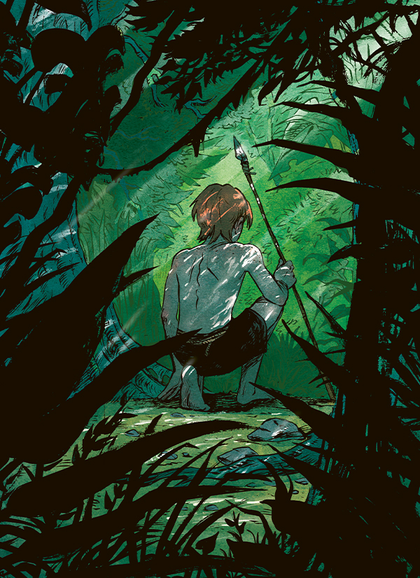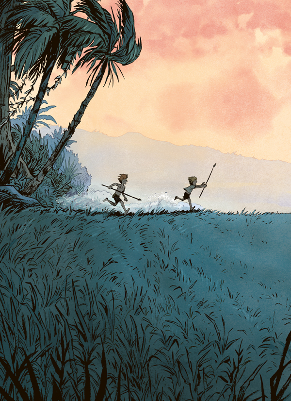 In 2024, to commemorate the 70th anniversary of the publication of Lord of the Flies, de Jongh won the commission to create the first official graphic novel adaptation. A full literary adaptation, de Jongh uses Golding’s original language, a carefully curated selection of dialog and exposition that punctuates each richly paneled and saturated scene with compelling illustrations that depict Golding’s dark subversion of the idealized, quintessentially British island adventure, turning it on its head into a grim psychological and moral study.