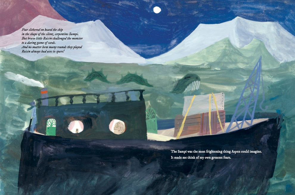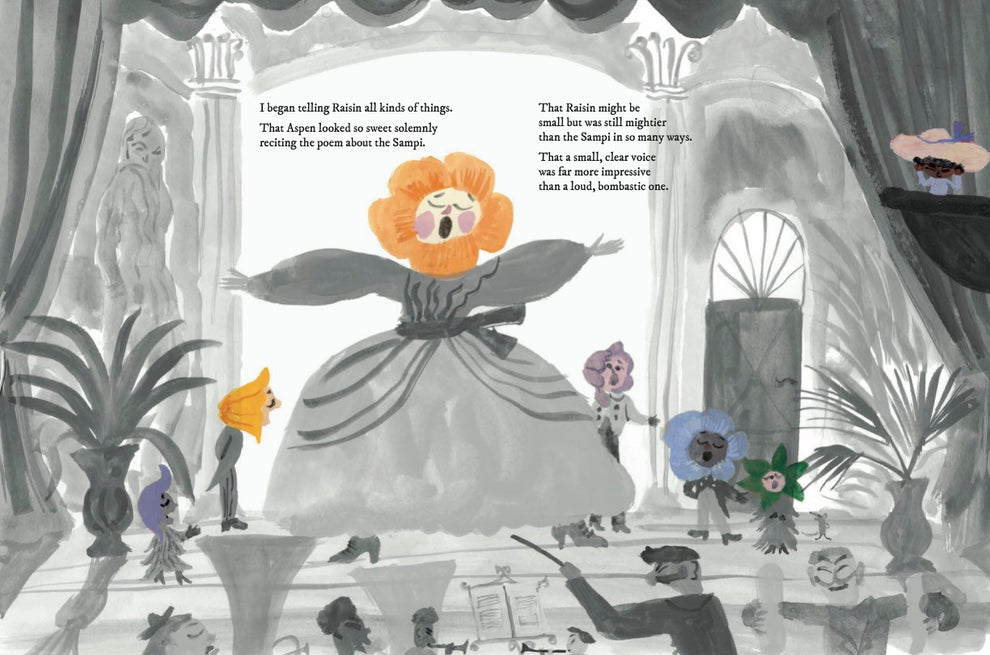 A Magician’s Flower is a gentle story with a small mystery at its heart. Willow and her pet chicken find an unknown plant in their greenhouse. They name the plant Raisin after a line from one of their friend Aspen’s poems. (With her dramatically oversized hat, Willow reminds me a bit of Pepito from Madeline and the Bad Hat!) Despite Willow’s care and attention, the seedling fails to grow. An attempt to help Raisin develop by introducing some fresh seaside air briefly goes awry, and Raisin disappears. The friends are reunited, though, and Raisin finally blossoms. The message is clear: Even the smallest and quietest amongst us will bloom with the right care and attention.