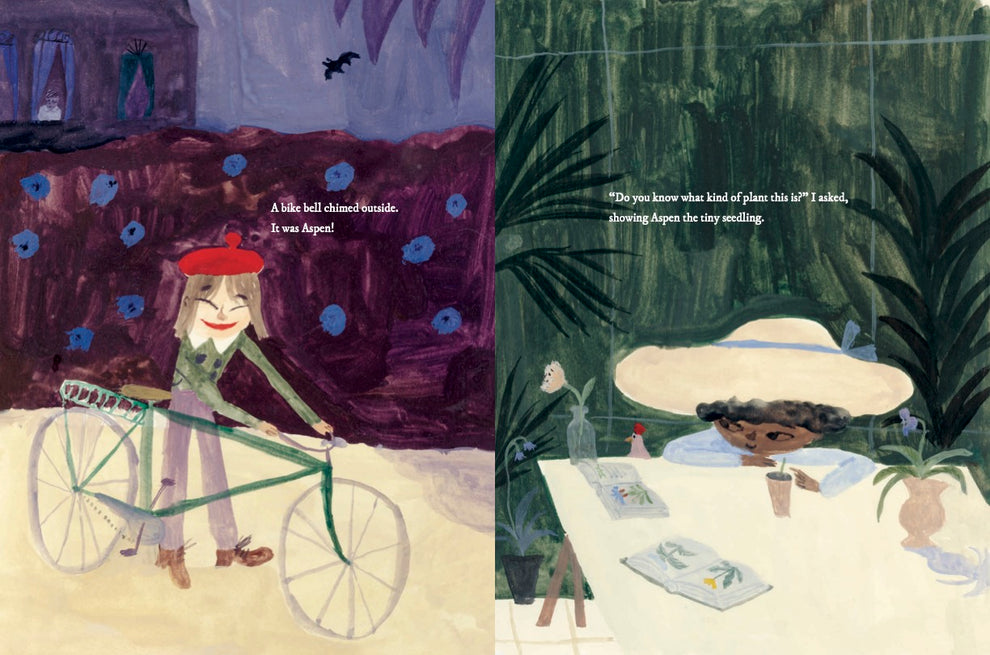 A Magician’s Flower is a gentle story with a small mystery at its heart. Willow and her pet chicken find an unknown plant in their greenhouse. They name the plant Raisin after a line from one of their friend Aspen’s poems. (With her dramatically oversized hat, Willow reminds me a bit of Pepito from Madeline and the Bad Hat!) Despite Willow’s care and attention, the seedling fails to grow. An attempt to help Raisin develop by introducing some fresh seaside air briefly goes awry, and Raisin disappears. The friends are reunited, though, and Raisin finally blossoms. The message is clear: Even the smallest and quietest amongst us will bloom with the right care and attention.