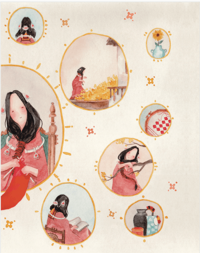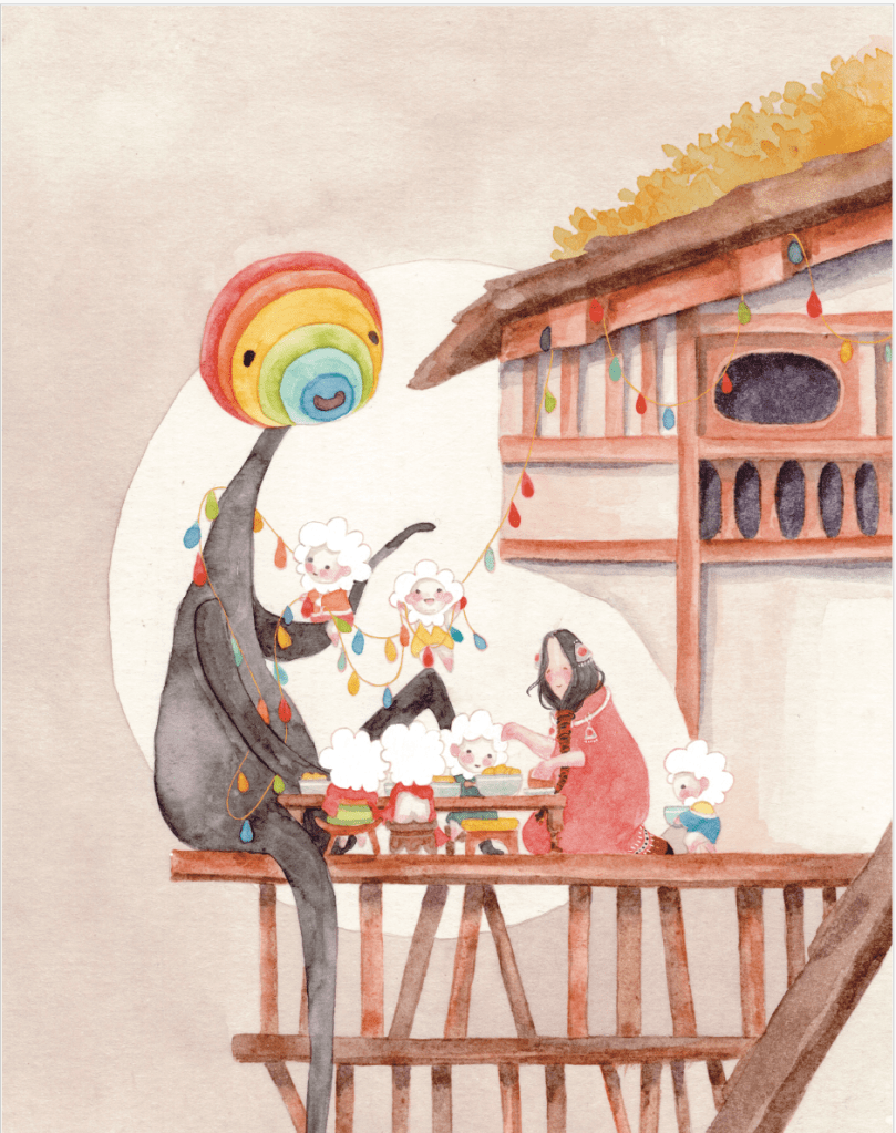 We follow Ane Donyi to her home to find a cosy space with paintings of yellow flowers. We watch her knit a scarf, cross-stitch, and read a book. When cloud babies gather around, they frolic together among magical beings, eventually reaching the Rainbow, where they all feast in harmony. Ane Donyi finally calls it a night and, as darkness enfolds, the reader wonders – does the sun truly sleep?