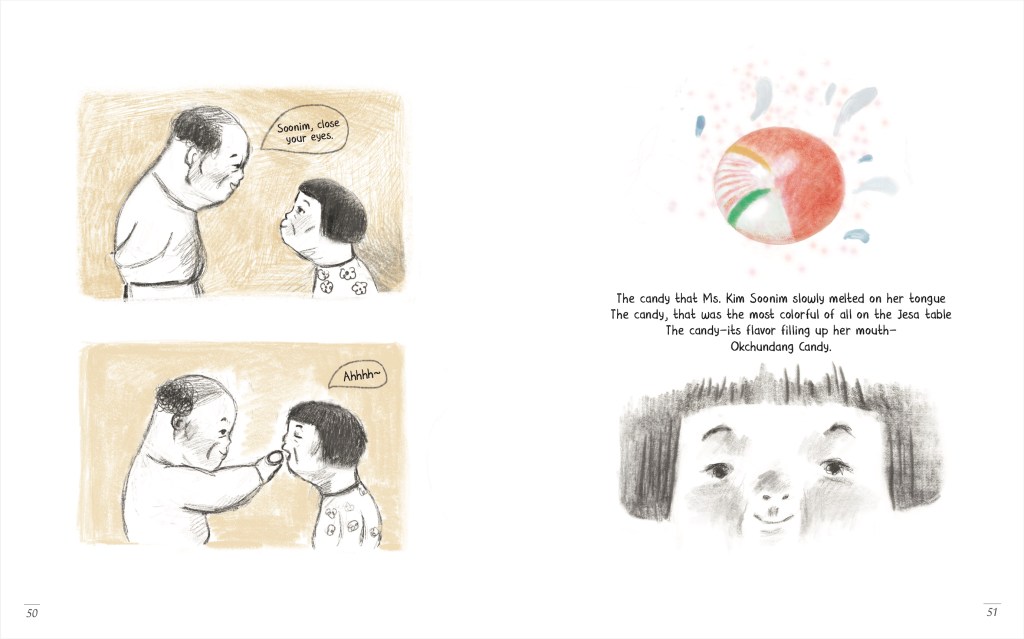 When I look back at the book’s cover and see the okchundang candies—once so small they could be cradled in grandfather’s palm as he gently placed them into grandmother’s mouth, now in flight and big enough to carry the two elders, looking each other in the eyes with a lifetime of love—I am sure that as long as people keep returning to okchundang candy every Jesa day to remember their ancestors, the life of Mr. Go Jadong and Ms. Kim Soonim, as well as the little girl’s memories at her grandparents’ house, will be kept forever sweet “with summer lingering.”