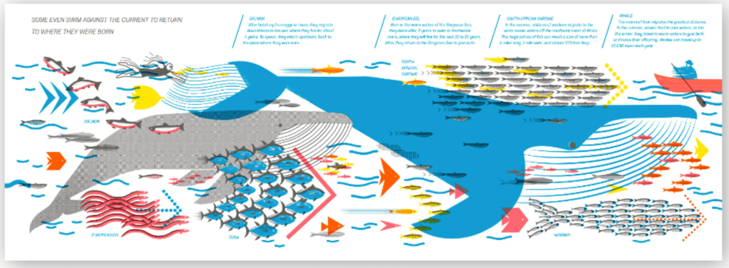 We are shown the challenges and varied routes creatures face — whether on land, in the sea, or in the air — as they journey back to where they were born, back to their roots.