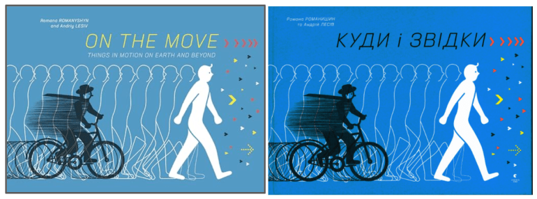 On the Move: Things in Motion on Earth and Beyond (2025) / Куди і звідки (2020), written & illustrated by Romana Romanyshyn & Andriy Lesiv, translated from Ukrainian by Oksana Lushchevska, is a visual non-fiction delight for readers of all ages, exploring the concept of motion for humans, animals, vehicles, wind, water, as well as planets.