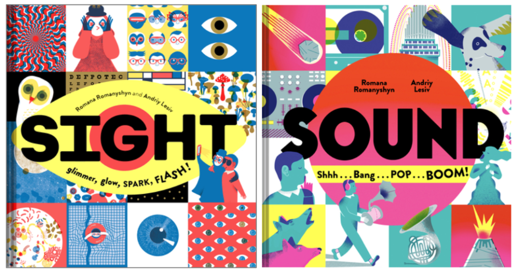 Two other books of theirs that are colorful, visual explorations of a concept (like On the Move) are: Sight: Glimmer, Glow, SPARK, FLASH! (2021, translated into English in 2021 by Vitaly Chernetsky) and Sound: Shhh…Bang…POP…BOOM! (2020, translated into English in 2020 by Vitaly Chernetsky).