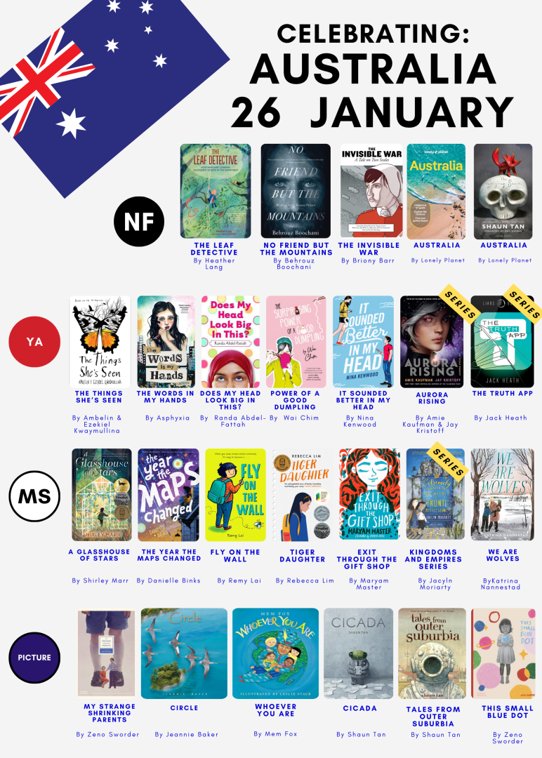 In anticipation of the country celebrations in January - here is my Australian poster - being an American school with relatively few Australian students, we don't have a very robust collection of books from Australia. There are all sorts of complications in procuring books from Australia - and as my fellow-librarians who I asked from … Continue reading #DecDisplays – Australian books